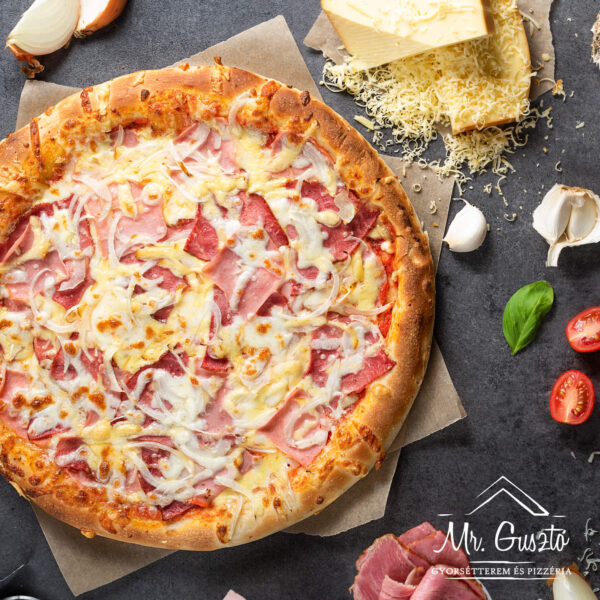 Paradicsomszósz, sonka, tarja, vöröshagyma, füstölt sajt