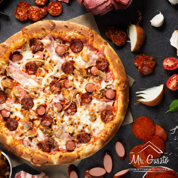 Paradicsomszósz, tarja, bacon, virsli, paprikás szalámi, gyros hús, kolbász, vöröshagyma, mozzarella sajt