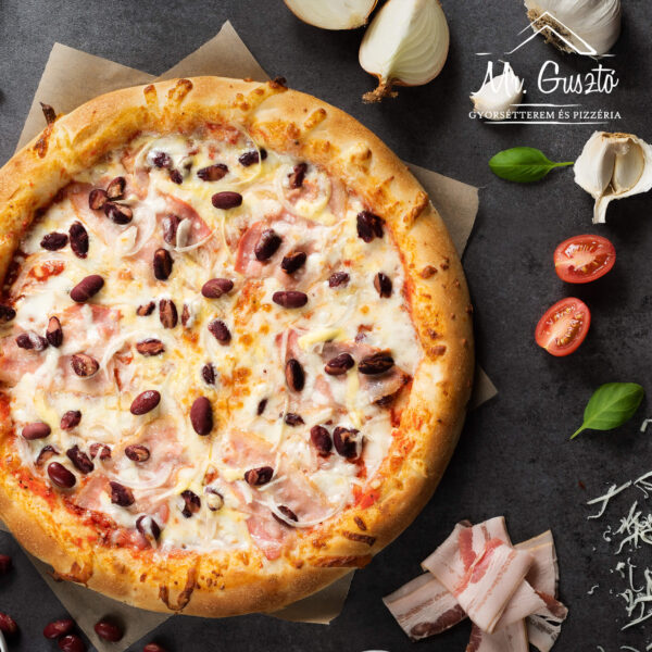 Paradicsomszósz, bacon, vöröshagyma, bab, mozzarella sajt