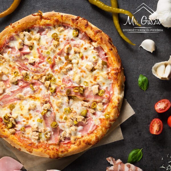 Paradicsomszósz, csirkemell, bacon, sonka, pepperoni paprika, mozzarella sajt