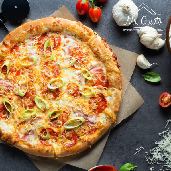 Fokhagymás-tejfölös alap, bacon, paprikás szalámi, póréhagyma, mozzarella sajt